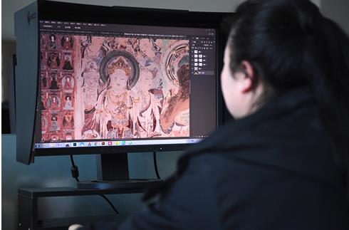 敦煌研究院文物数字化保护团队图像处理人员年海丽在拼接壁画图像(2023年4月25日摄)。数字化探索为莫高窟的保护与传承开辟了全新路径,数字技术让敦煌文物走出洞窟,跨出国门,走向“永久保存、永续利用”。新华社记者 陈斌 摄