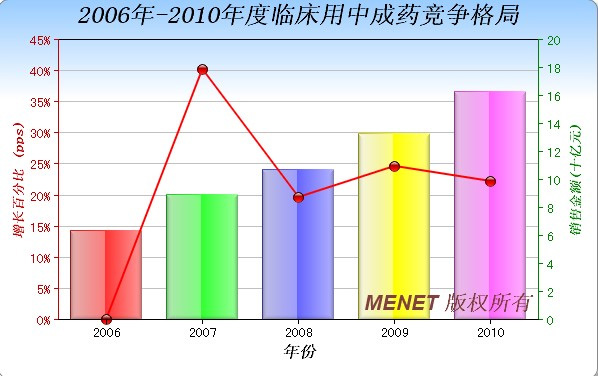 国家发改委日前公布,2010年我国中成药制造业总产值为2587.05亿元,同比增长25.83%,新产品产值323.69亿元,同比增长26.41%,工业销售产值2429.49亿元,同比增长25.08%,显示出2010年我国中成药行业仍在快速增长。