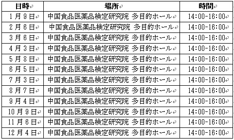 2015年、中国食品医薬品検定研究院はサービス水準を高め、交流の場をつくり、ユーザーによる製品検査測定関係質問に回答するために、引き続き業務相談日というイベントを開催する予定である。具体的なスケジュールは以下のとおりである。